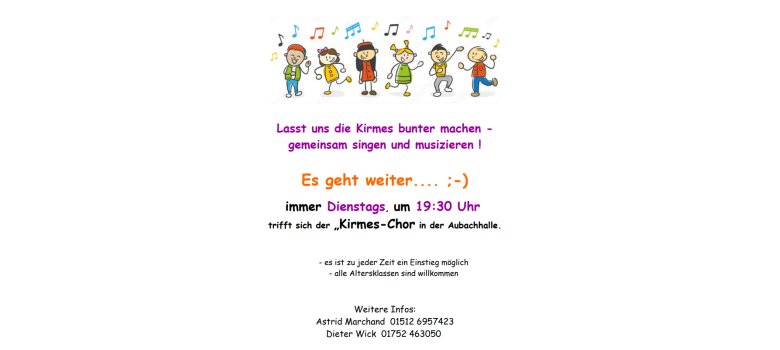 Weiterhin findet jeden Dienstag um 19:30 Uhr ebenfalls im Sitzungssaal der Aubachhalle das Treffen des Projektchors zur Kirmes 2024 statt. Neueinsteiger sind jederzeit herzlich willkommen.