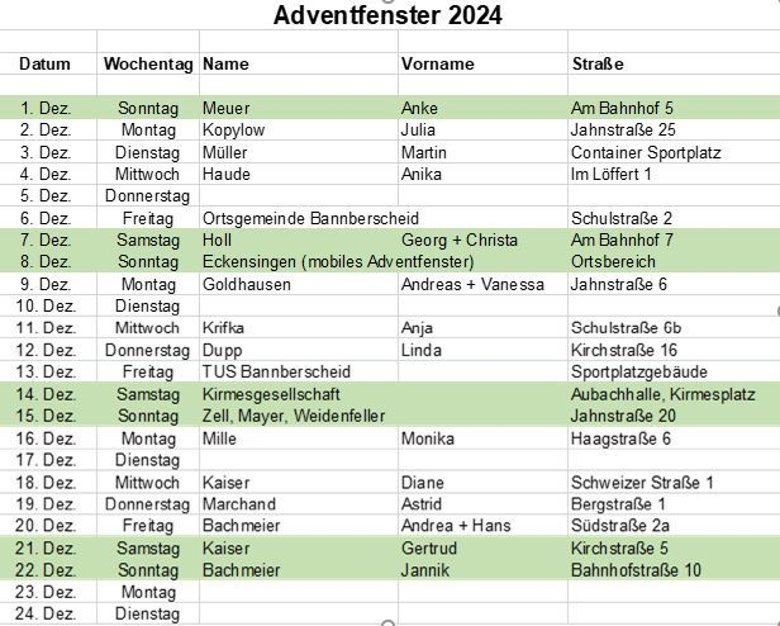 In den nächsten Ausgaben des Wochenblatts wird fortlaufend über Zeit und Ort des jeweiligen Adventfensters berichtet werden. Nachmeldungen sind, soweit noch Termine frei sind, jederzeit möglich.