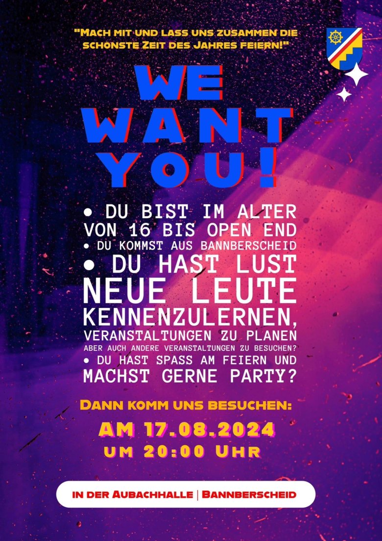 Am 17. August trifft sich die KG Bannberscheid um 20:00 Uhr im Sitzungssaal der Aubachhalle zu ihrem nächsten Treffen (s. nachstehendes Plakat).