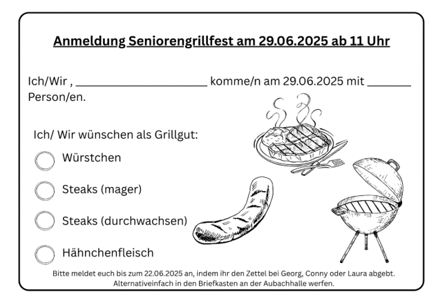 Kommt vorbei und genießt einen geselligen Tag mit leckerem Essen und Trinken, für das selbstverständlich die Gemeinde sorgt. Um die Veranstaltung besser planen zu können, bitten wir, die Anmeldung bis zum 22. Juni 2025 bei Georg, Conny oder Laura abzugeben, alternativ auch in den Briefkasten der Aubachhalle einwerfen oder die Anmeldungen per Mail an georg.holl@bannberscheid.de richten oder telefonisch an mich unter 0178 9388256.