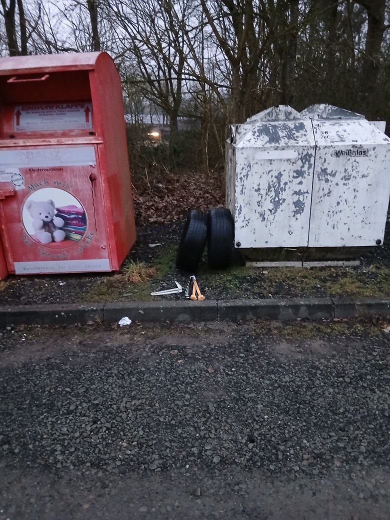 Die WAB hat natürlich diesen Abfall nicht mitgenommen, sodass dieser am Straßenrand verbleiben ist. Beispielhaft hier das Bild von 2 Altreifen, welche zunächst am Bauhof abgelagert wurden und am nächsten Tag sich am Glascontainer einfanden.