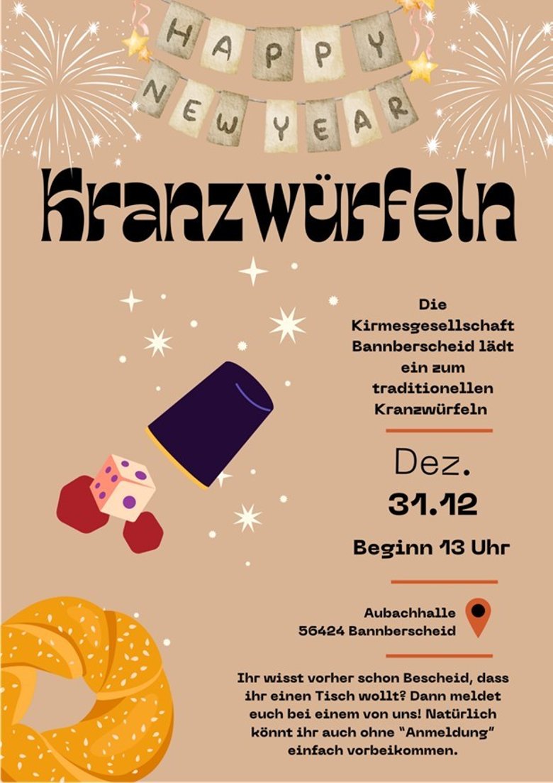 Nach dem großen Erfolg im letzten Jahr, lädt auch in diesem Jahr unsere KG zum beliebten Kranzwürfeln an Silvester ein