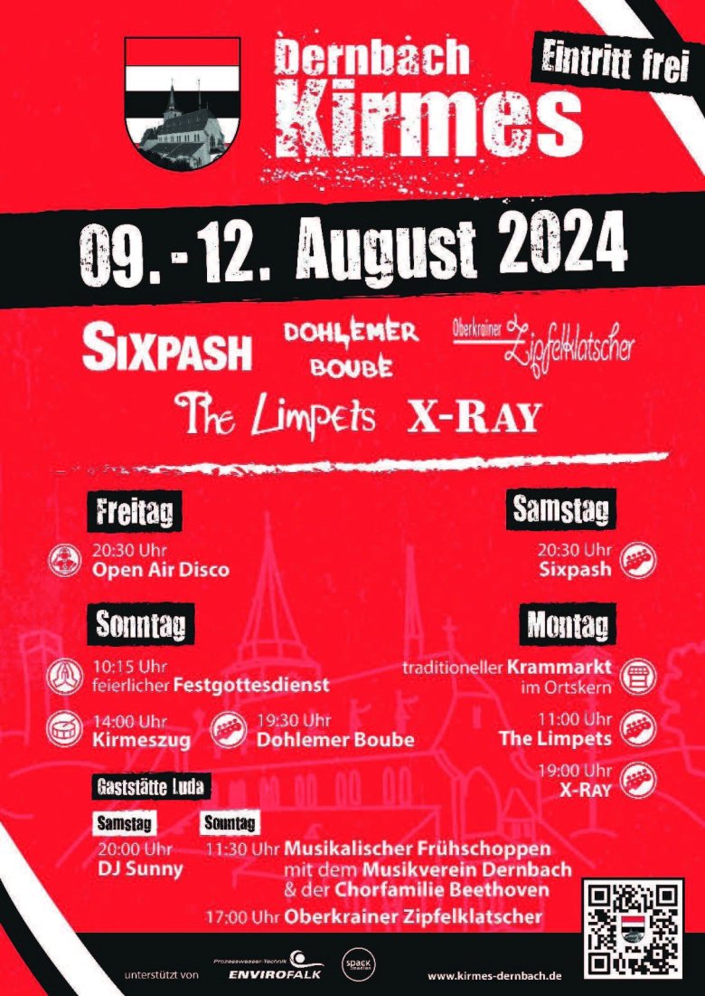 Die Kirmesgesellschaft mit Unterstützung der Kirmes Altstars und auch in diesem Jahr neben den Dernbacher Gastwirten wieder unser Festwirt haben sich auf dieses Fest vorbereitet. Wir können unsere Kirmes im Mittelpunkt unseres Dorfes, in unmittelbarer Nähe unserer Pfarrkirche auf und um den Rathausplatz vor unserem Rathaus und unserem Gemeindezentrum und in der eigens eingerichteten Fußgängerzone feiern
