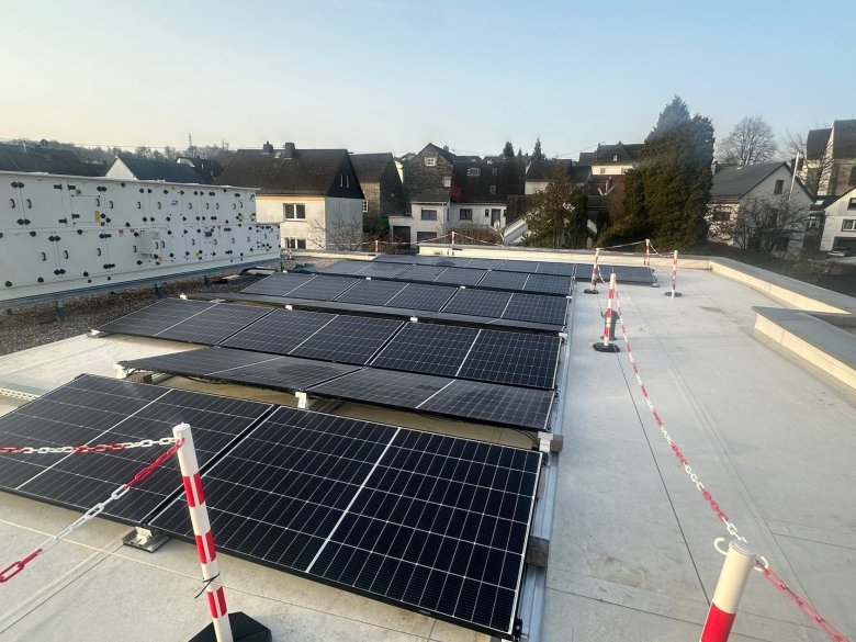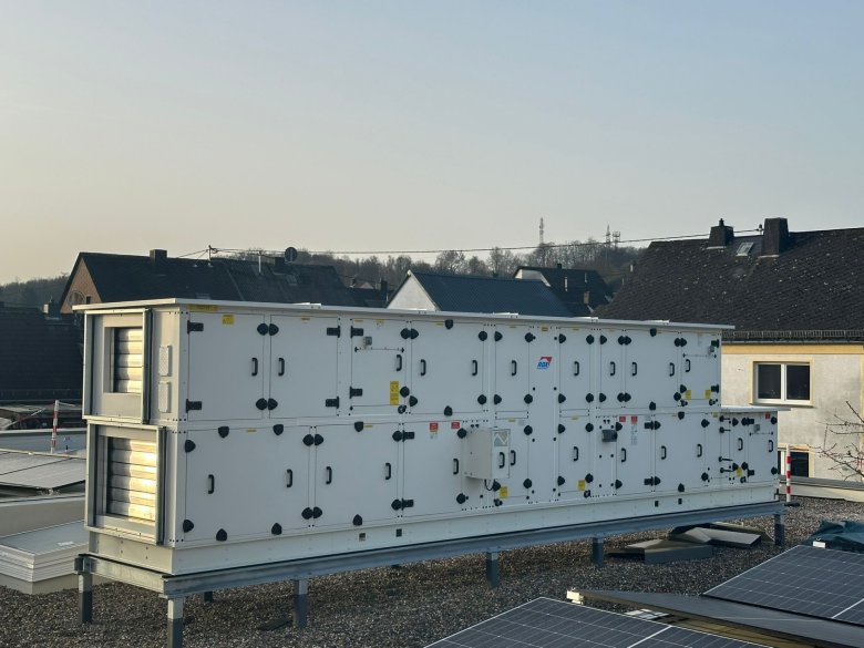 Auch auf dem Dach hat sich einiges getan: Die Photovoltaikanlage ist bereits montiert und muss nun noch angeschlossen werden. Zusätzlich wurde die Belüftungsanlage auf dem Dach installiert, die später für ein gutes Raumklima in der neuen Kita sorgen wird.