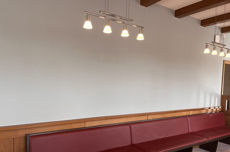 Im Bereich über der langen Sitzbank wurden die Streben und Regale entfernt und es ist eine große einheitliche Fläche entstanden, die z.B. mit einem Schriftzug und verschiedenen historischen Fotografien aus Leuterod in unterschiedlichen Formaten und Rahmungen angebracht werden könnten.