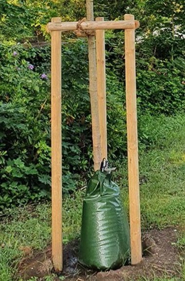 Die Säcke fassen etwa 100 Liter und geben tröpfchenweise, über mehrere Tage, das lebensnotwendige Nass in den Boden ab. Dies ist eine enorme Verbesserung gegenüber früher, wo fast täglich bei trockener Witterung mit Schlauch und Fass bewässert werden mußte.