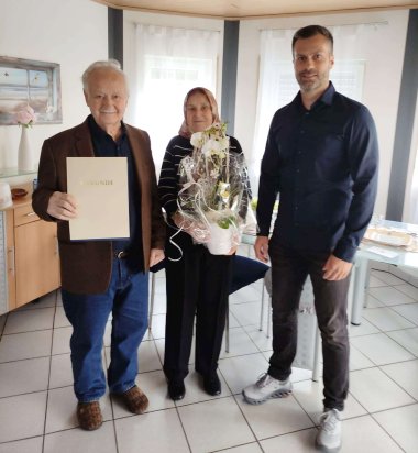 Im Namen der Ortsgemeinde überbrachte Manuel Hemmerling dem Jubelpaar seine herzlichsten Glückwünsche. Gleichzeitig richtete er auch die Grüße von Bürgermeisterin Alexandra Marzi aus und überreichte anlässlich des Jubiläums eine Urkunde sowie ein Präsent.
