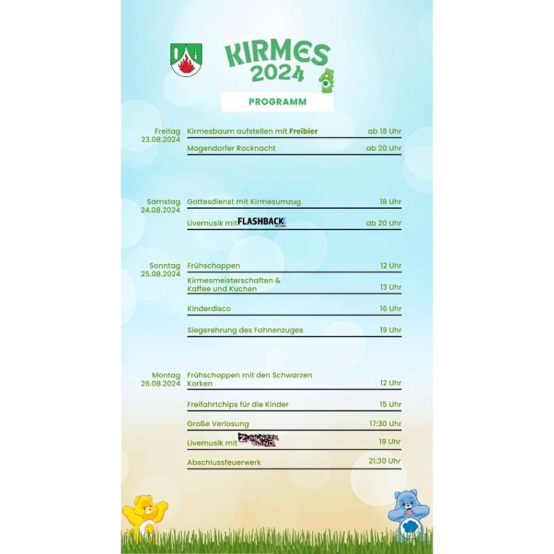 Liebe Mitbürgerinnen und Mitbürger, eine Kirmes lebt von ihren Gästen. Die Kirmes kann nur gut werden, wenn Sie, liebe Mogendorfer, den Veranstalter, die Organisatoren und den Schausteller – der uns im Übrigen seit Jahrzehnten die Treue hält - durch Ihr Kommen unterstützen.