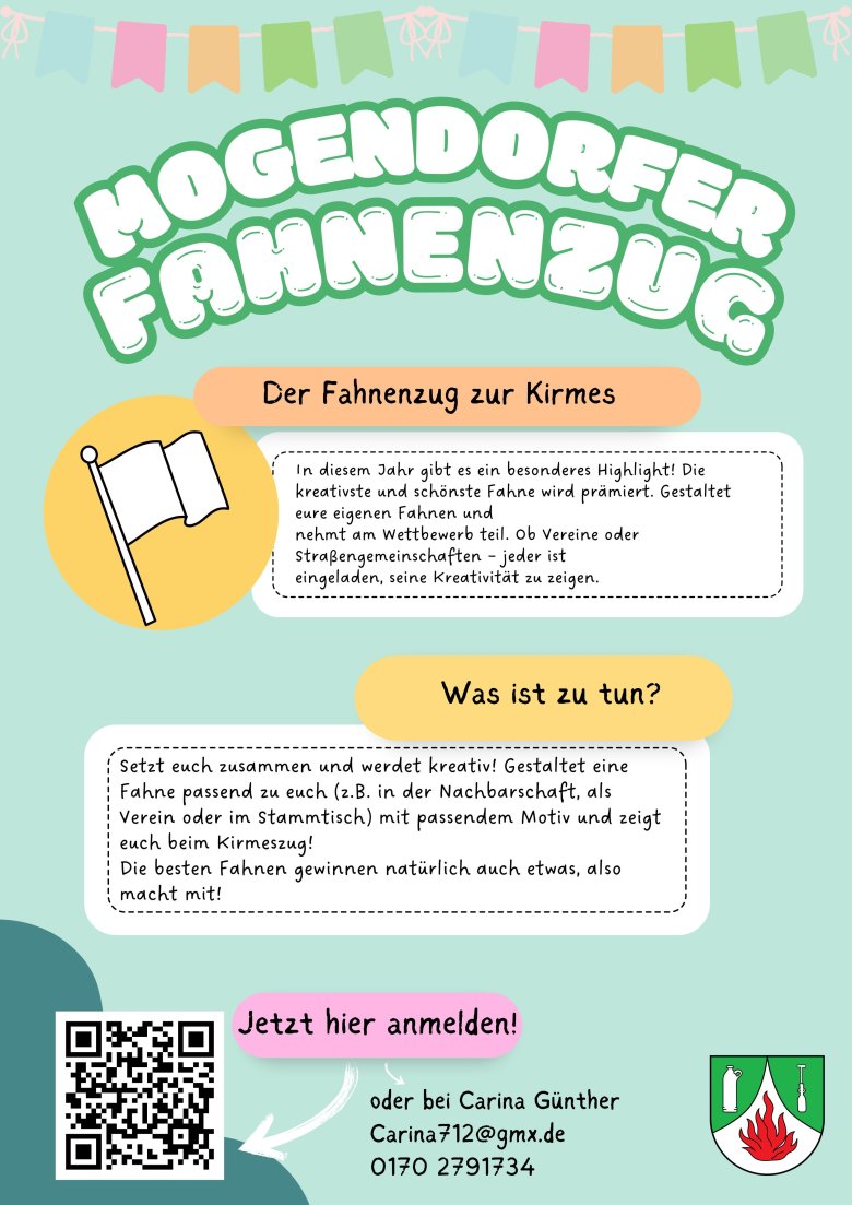 In diesem Jahr freuen wir uns über viele Gruppen, kleine und große, jung und alt, Nachbarn, Freunde, Vereine, die mit einer selbst gestalteten Fahne, passend zum Motto der Gruppe, zur Kirmes, zu Mogendorf o.ä. am Zug teilnehmen. Viele erinnern sich ganz bestimmt an den Kirmesumzug im Jahr 2011: viele Gruppen mit selbst gestalteten Bollerwagen (oder auch größeren), die bereits im Vorfeld beim Sammeln von Ideen und Herrichten der Wagen und auch während des Zuges großen Spaß hatten. Lasst uns hier anknüpfen, trefft euch, seid kreativ und fiebert dem Kirmessamstag entgegen. Die „schönste“ Fahne wird prämiert und die Sieger am Kirmessonntag geehrt.