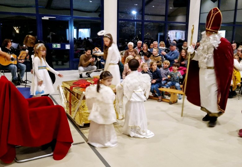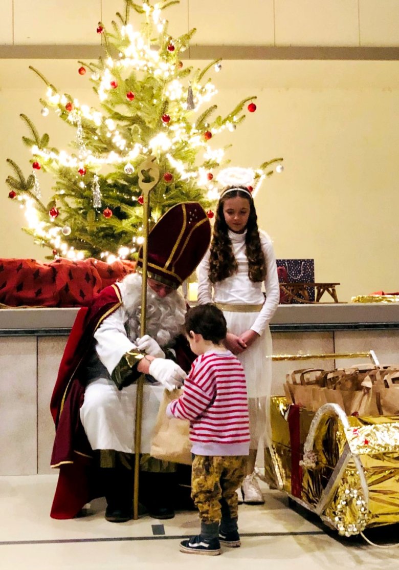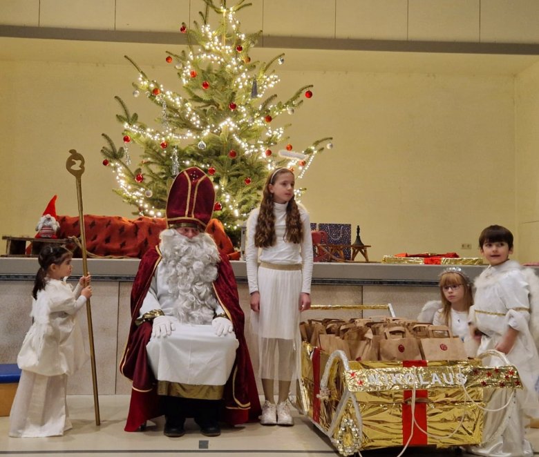 Punkt 17:30 Uhr betrat der Nikolaus die Halle. Sein Bischofsgewand leuchtete warm, sein weißer Bart wallte majestätisch und in seinem goldenen Wagen klangen die Geschenke geheimnisvoll. Die Kinder saßen mucksmäuschenstill, zwischen Ehrfurcht und aufgeregtem Kichern hin- und hergerissen.