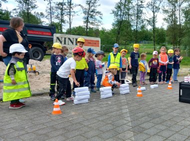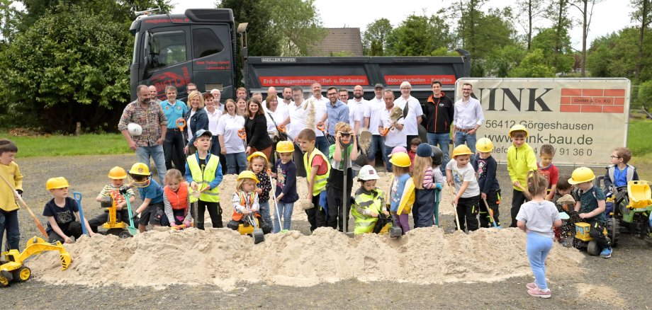 Dann erfolgte der eigentliche Spatenstich. Hier bot sich ein tolles Bild, bei dem die Kids die Stars waren. Bewaffnet mit Bauhelmen, Warnwesten, Schaufeln und Baggern, durften sie in der ersten Reihe im Sand graben. Die Erwachsenen schwangen in zweiter Reihe die Spaten und wirbelten den Sand durch die Luft.