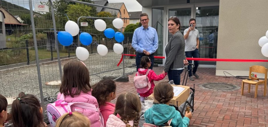 Am Eingang der neuen KiTa wurden sie herzlich von Ortsbürgermeister Marco Geibert empfangen. Der Eingang war mit Luftballons geschmückt, eine rote Schleife markierte den symbolischen Übergang. Gemeinsam mit KiTa-Leiterin Michaela Hoffmann und den Kindern durchtrennte Ortsbürgermeister Geibert die Schleife – ein feierlicher Moment, der von allen Anwesenden mit Freude und Spannung erlebt wurde.