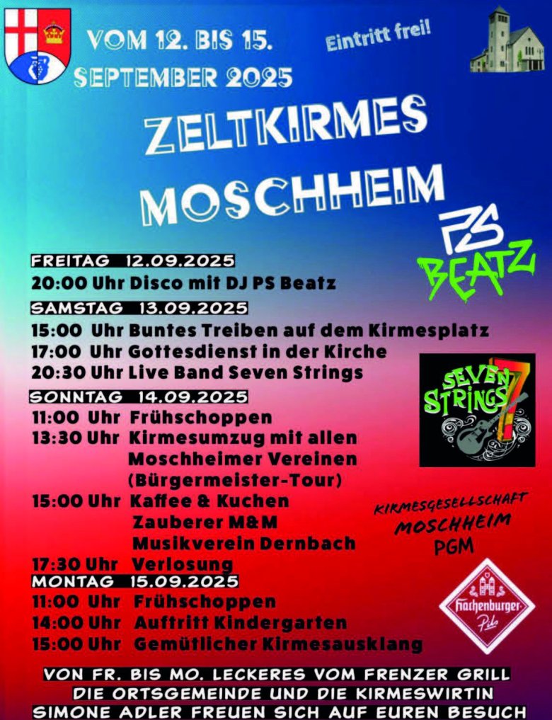 Am Samstag, 13. September, beginnt der Tag ab 15:00 Uhr mit dem bunten Treiben auf dem Festplatz, um 17:00 Uhr wird’s feierlich, gemeinsam erleben wir in der Paulus-Kirche Moschheim eine Vorabendmesse zum Kirchweihfest 2025. Im Anschluss daran geht es direkt auf den Kirmesplatz ins Festzelt, wo Kirmeswirtin Simone Adler und ihr Team für das leibliche Wohl sorgen. In diesem Jahr gibt es eine vielfältige Auswahl an Speisen vom Frenzer Grill. Ab 20:30 Uhr übernimmt die Live-Band Seven Strings die Bühne und sorgt mit ihrer Musik für ausgelassene Stimmung bis in die Nacht.