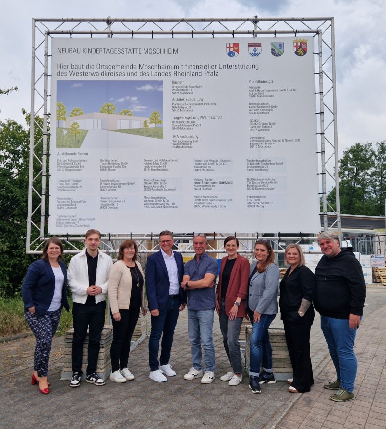 Bürgermeisterin Alexandra Marzi, KiTa-Koordination VG Wirges Jannik Quirmbach und Betina Schmidt, Ortsbürgermeister Marco Geibert, 1. Beigeordneter Jens Luber, stellv. KiTa-Leitung Moschheim Annika Costa, KiTa-Leitung Moschheim Michaela Hoffmann, KiTa-Leitung Ötzingen Dorota Kwidzinski, KiTa- Koordinator Bistum Limburg Thomas Baecker