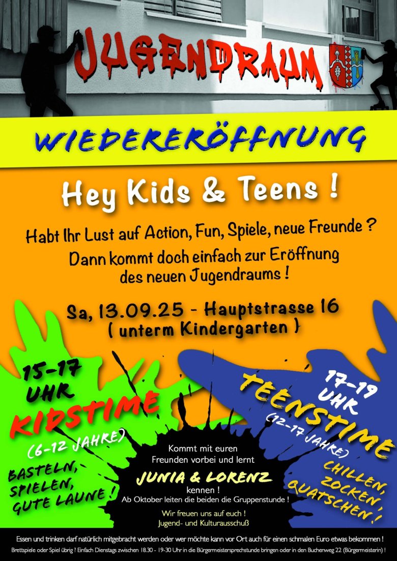 Hey Kids & Teens !Habt Ihr Lust auf Action, Fun, Spiele, neue Freunde ?Dann kommt doch einfach zur Eröffnung des neuen Jugendraums!Samstag, 13.09.2025, Hauptstraße 16 (unterm Kindergarten)