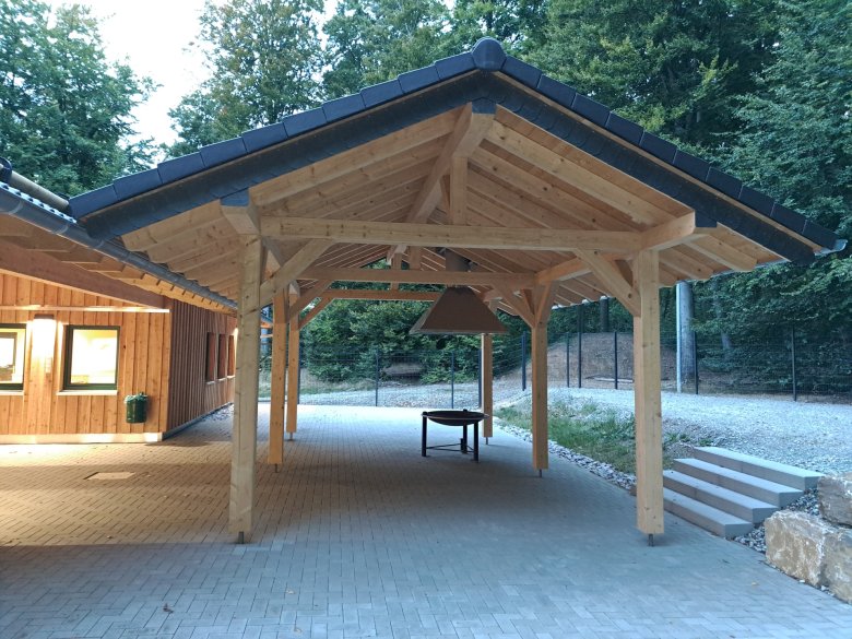 - Der große überdachte Grillplatz ist unmittelbar angegliedert, man kann von dort trockenen Fußes alle Gebäudeteile sowie Sanitäreinrichtungen begehen. Grillkohle wird seitens der Gemeinde vorgehalten, diese kann gegen Entgeld genutzt und nach Gebrauch mit dem Hausmeister abgerechnet werden