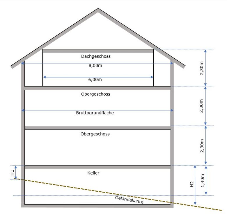 Ein Keller ist ein Vollgeschoss, wenn seine Deckenoberkante im Mittel mehr als 1,40 m über die Geländeoberfläche hinausragt und wenn die Geschosshöhe 2,30 m beträgt.