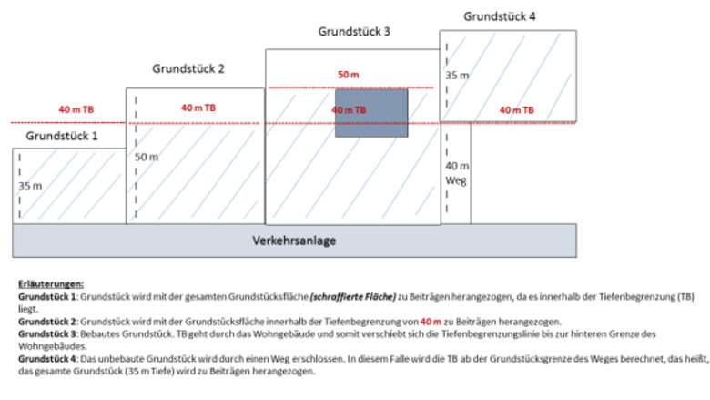 Der Grundstücksteil, der hinter dieser 40 m-Begrenzung liegt, wird bei der Berechnung der beitragspflichtigen Grundstücksfläche nicht mit einbezogen. Liegt das Grundstück innerhalb des Geltungsbereichs eines Bebauungsplanes findet die Tiefenbegrenzung keine Anwendung.
