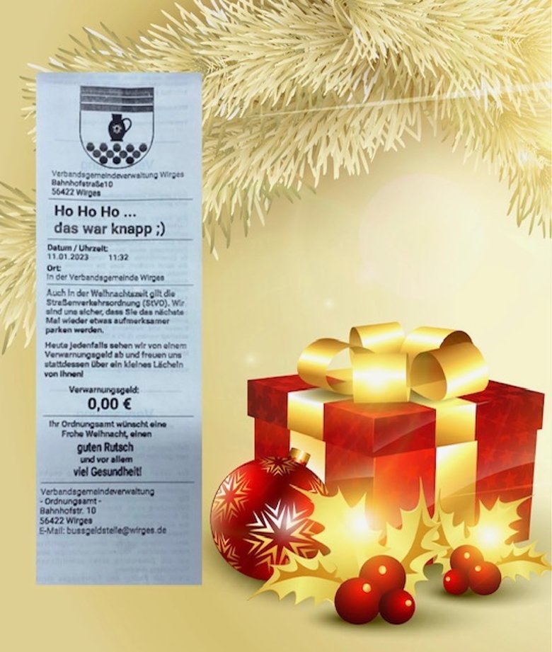 „Auch in der Weihnachtszeit gilt die Straßenverkehrsordnung (StVO). Wir sind uns sicher, dass Sie das nächste Mal wieder etwas aufmerksamer Parken werden“, stand dort, wo sonst ein Verwarnungsgeld stehen würde. Das Ordnungsamt der Verbandsgemeinde Wirges lies damit bei geringfügigen Vergehen Gnade walten und beschenkte die Bürger*innen mit einem 0,00 € Verwarngeld. „Heute jedenfalls sehen wir von einem Verwarnungsgeld ab und freuen uns stattdessen über ein kleines Lächeln von Ihnen!“ war weiter auf dem Knöllchen zu lesen.