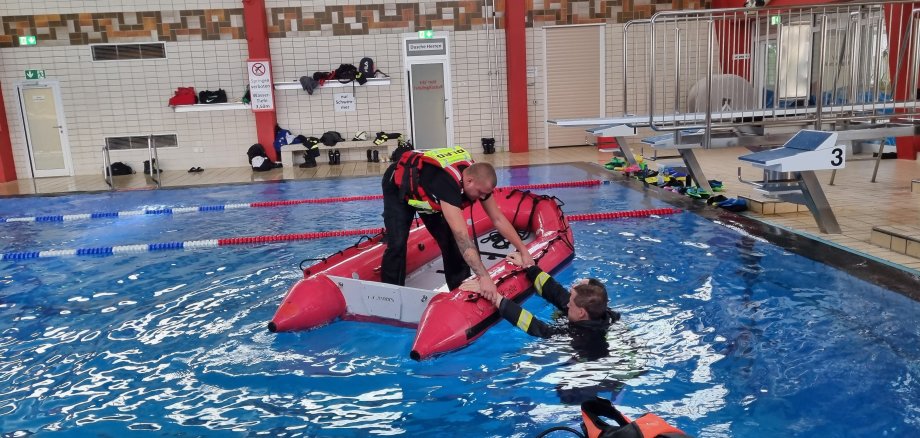 Geübt wurde unter anderem der richtige Umgang mit dem Rettungsboot (RTB1). Zudem konnten einige Experimente durchgeführt werden. Beispielsweise ging es für die Feuerwehrleute darum selbst zu testen und zu erfahren, wie sich die Einsatzkleidung im Wasser verhält oder wie sich die Wathose mit Wasser füllt.