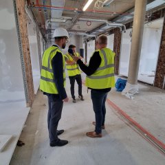 Vielmehr sind die beiden Bürgermeister unterwegs - und zwar im Rohbau des neuen Verbandsgemeindehauses in Montabaur. Gemeinsam mit Projektleiter Stefan Baumgarten und Moderator Tom Neumann geht es mit dem Mikrofon in der Hand durch die Baustelle, auf der fleißig am Innenausbau gearbeitet wird.