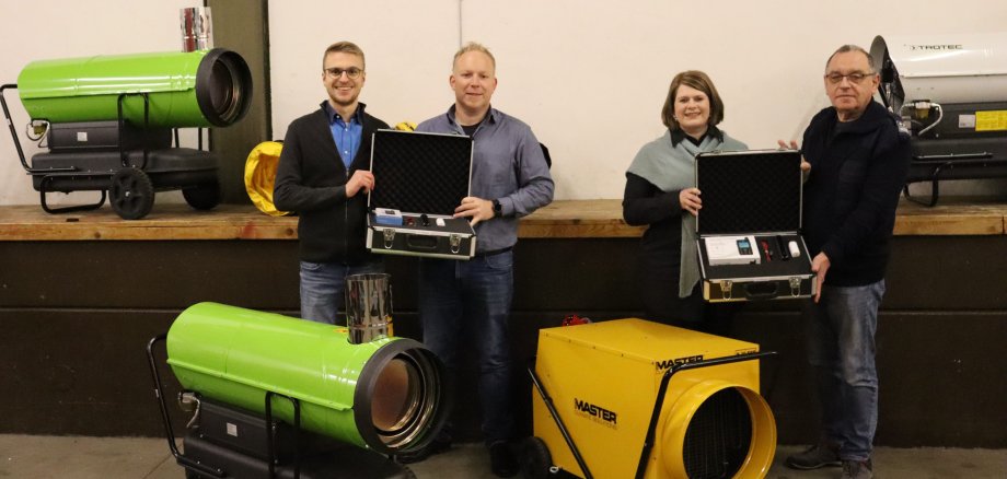 Bürgermeisterin Alexandra Marzi freute sich zusammen mit Fachbereichsleiter Mark Goldhausen, Sachbearbeiter Lucas Erner und Wehrleiter Thomas Huberty die 13 beschafften Heizlüfter sowie 3 Satellitentelefone in Empfang zu nehmen.