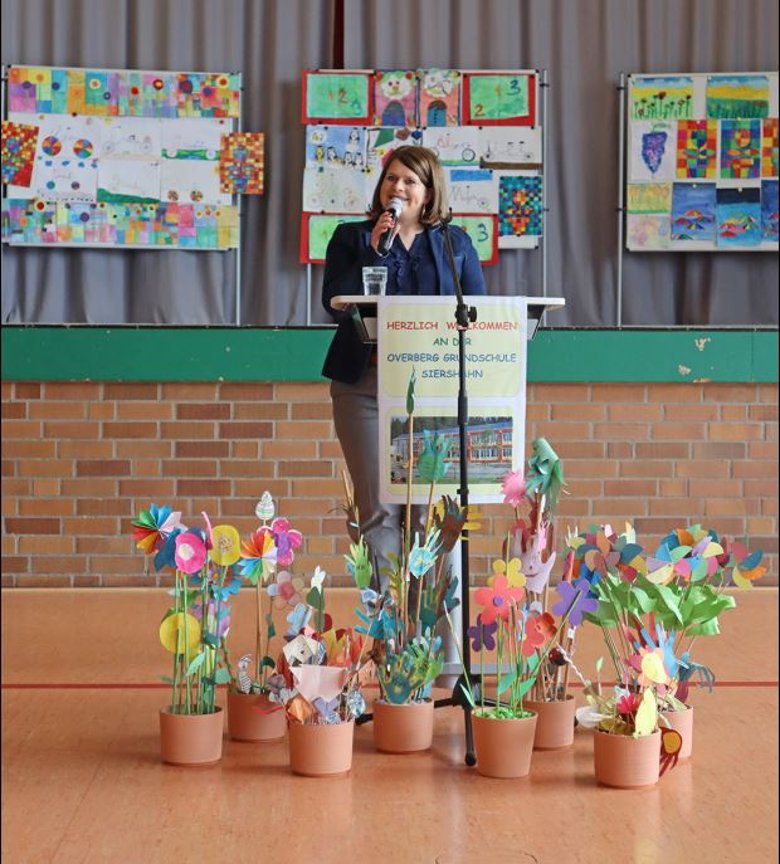 In ihrer anschließenden Rede zeigte sich Petra Stumpf überwältigt von so viel Einsatz, Zuspruch und lobenden Worten und bedankte sich bei allen, im Besonderen bei ihrem Mann und ihrer Familie, die sie in ihrer Entscheidung, Schulleiterin zu werden, bestärkt und unterstützt haben. Ein großes Dankeschön richtete sie auch an Susanne Letschert, die ihr als Konrektorin immer mit Rat und Tat zur Seite steht und als „Overbergdino“ weiß, was zu tun ist. Die freundliche Aufnahme durch und in das Kollegium haben Petra Stumpf den Einstieg in ihre Arbeit als Schulleiterin leicht gemacht, so ihre Worte.