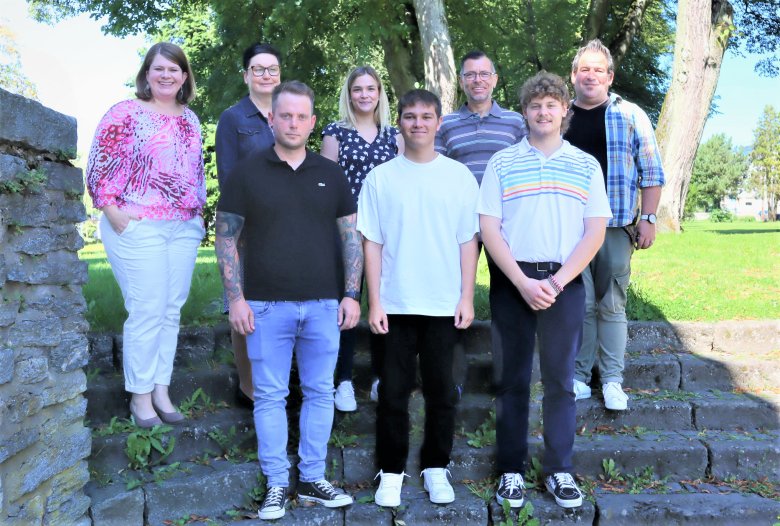Von links: Bürgermeisterin Alexandra Marzi, Kaufmännische Werkleiterin Ulrike Pfirrmann, Daniel Preußer, Ausbildungsbeauftragte Selina Döhring, Philip Krasikow, Personalratsvorsitzender Dirk Kaltenbach, Thomas Root und Stv. Büroleiter Sören Dickopf