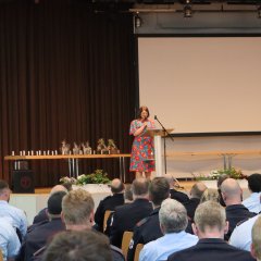 In ihrer Rede sprach Marzi allen Feuerwehrmännern und -frauen ihre höchste Anerkennung für deren geleistete Arbeit aus und bedankte sich von ganzem Herzen für das besondere ehrenamtliche Engagement der Kameradinnen und Kameraden. „Gemeinsam mit dem Kreisfeuerwehrverband und Ralf Felix Kespe nutzen wir heute die Gelegenheit und sprechen den zu Ehrenden Kameraden unseren Dank für 450 Jahren aktiver Feuerwehrdienst aus“, so Marzi. Anschließend stellte Marzi vor, was seit dem letzten Feuerwehrehrentag alles geschah und gemeinsam bewegt wurde. „Seit unserem letzten Treffen ist viel geschehen, ihr alle, wir alle waren sehr fleißig“, sagte sie und erwähnte beispielsweise weitere freigesetzte Mittel für die Beschaffung von Stiefeln oder Aktivitäten für die Alterskameraden, ein Arbeitskreis Nachwuchsgewinnung wurde ins Leben gerufen, die Öffentlichkeitsarbeit vertieft, neue Fahrzeuge angeschafft.