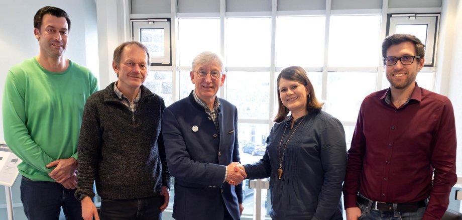 Foto: Teilnehmer des Gespräches v.l.n.r.: Andreas Schwind, Gruppenleiter Bauen, Klimaschutz und Immobilien; Dipl.-Biologe Immo Vollmer, Naturschutzreferent der NI; Harry Neumann, Vorsitzender der Naturschutzinitiative e.V.; Bürgermeisterin Alexandra Marzi; Martin Menges, Fachbereichsleiter Bauen, Klimaschutz und Immobilien