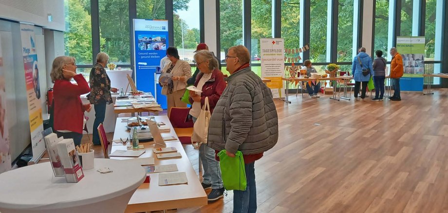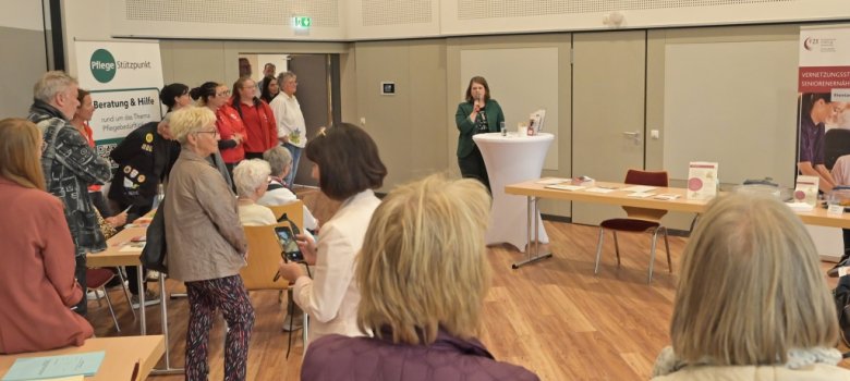 Vor und nach den Vorträgen bot die Veranstaltung reichlich Raum für Gespräche: Angehörige, Betroffene, Fachkräfte und Interessierte kamen ins Gespräch und sammelten Kontakte zu Unterstützungsangeboten in der Region. Informationsstände boten Materialien zu Pflegemöglichkeiten, Selbsthilfegruppen und Beratung. Des Weiteren bot die Veranstaltung Übungen und Simulationen, die den Alltag von älteren Menschen bzw. Demenzerkrankten erfahrbar machten. Teilnehmende konnten selbst erleben, wie sensorische Einschränkungen die Lebenswelt verändern – ein eindrücklicher Beitrag, um Empathie und Verständnis zu fördern.
