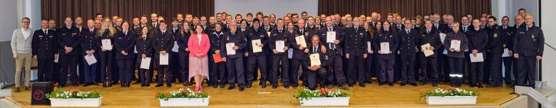 Knapp 300 Feuerwehrfrauen und Feuerwehrmänner waren der Einladung der VG um Bürgermeisterin Alexandra Marzi gefolgt. Auf dem Programm standen unter anderem Beförderungen und Auszeichnungen für verdiente Wehrleute.