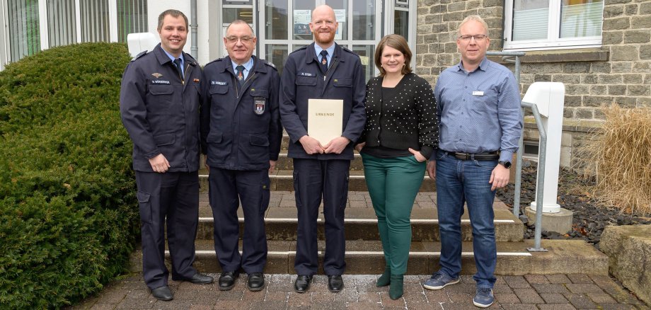 In einer gemütlichen Runde bedankte sich Bürgermeisterin Alexandra Marzi gemeinsam mit Wehrleiter Thomas Huberty, dem stellvertretenden Wehrleiter Nicolas Wörsdörfer und Fachbereichsleiter „Bürgerdienste, Bildung und Soziales“ Mark Goldhausen herzlich bei Matthias Stein für die hervorragende Zusammenarbeit und sein Engagement.