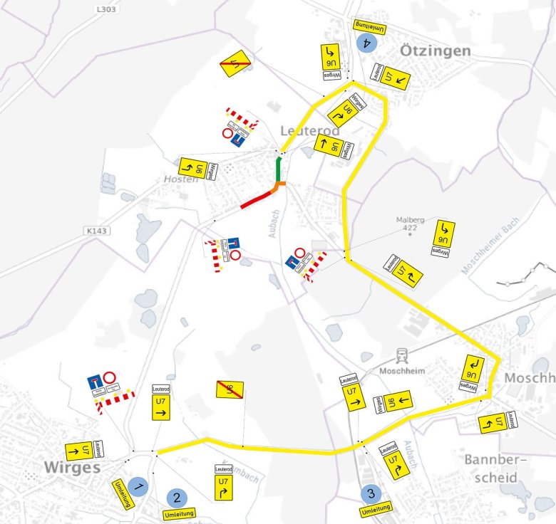 Der Durchgangsverkehr in Richtung Wirges wird über die Kreisstraßen 144 und 81 umgeleitet. Die Umleitungsstrecken sind entsprechend ausgeschildert.